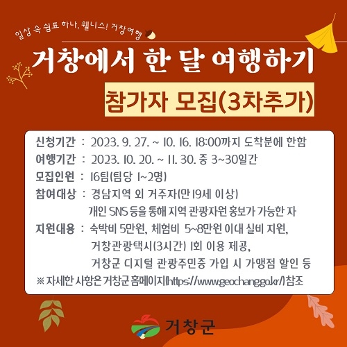거창에서 한 달 여행하기 프로그램은 여행 기간 개인 사회 관계망 서비스(SNS)를 통해 거창관광 홍보를 적극적으로 수행한 참가자에게 2박 이상 29박까지의 숙박비(팀당 1일 5만 원 이내)와 관광자원·지역문화, 예술·역사·축제 등 체험비(1인당 5만∼8만 원)를 지원하는 사업이다.