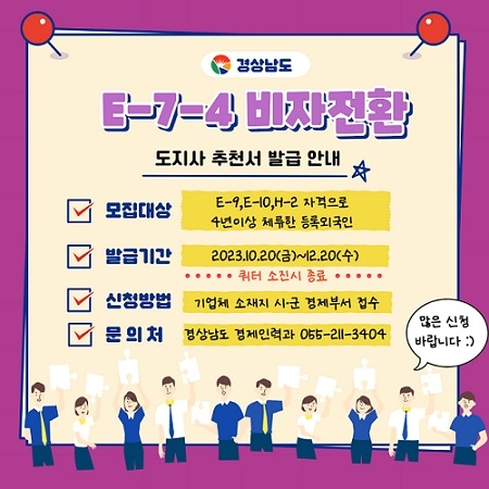 경남도는 조선업·제조업 등 인력부족을 해소하고 지역균형 발전을 위해, 숙련기능인력이 장기 취업할 수 있는 비자 전환(E-7-4)시 도지사가 추천하는 '숙련기능인력 E-7-4 비자 광역지자체 추천제도'를 신설·시행한다고 18일 밝혔다.