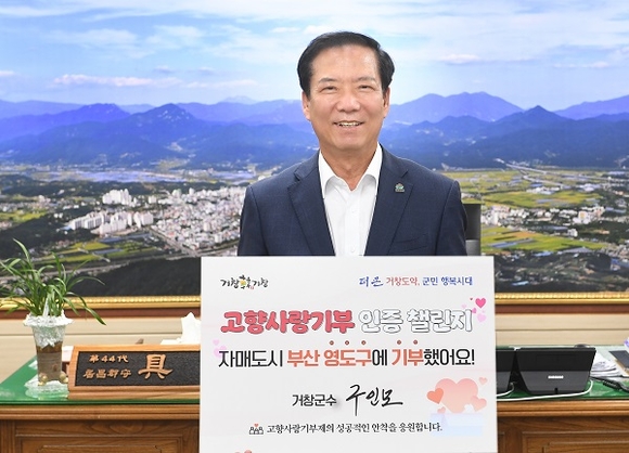 구인모 거창군수는 지난 19일 고향사랑기부제 활성화와 성공적 안착을 위한 '고향사랑기부 인증 챌린지'에 동참했다.