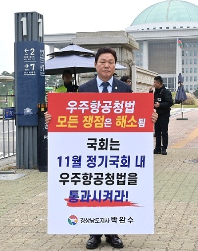 박완수 경남도지사가 1일 국회를 찾아 '우주항공청 설치 및 운영에 관한 특별법'의 조속한 통과를 촉구하기 위해 1인 시위와 기자회견을 가졌다.