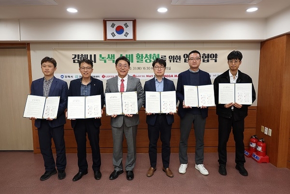 경남 김해시는 친환경 녹색소비 활성화를 위해 경남녹색구매지원센터, 롯데마트 김해점, 롯데마트 장유점, 메가마트 김해점, 이마트 김해점과 녹색제품 판매사업장 업무협약을 체결했다고 1일 밝혔다.