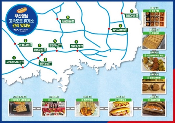 우수 간식으로는 ▲산청(대전)휴게소 '산청딸기라떼' ▲진영(순천)휴게소 '치즈삼색주먹밥튀김’ ▲사천(순천,부산)휴게소 '치즈품은남해멸치바' ▲통도사(부산)휴게소 '수제전병' ▲함안(부산)휴게소 '감잡은와플' ▲진주(부산)휴게소 '육전떡볶이' ▲현풍(창원)휴게소 '현풍도깨비빵' ▲문산(순천)휴게소 'MH핫도그' ▲외동(부산)휴게소 '주령구빵'이 선정됐다.