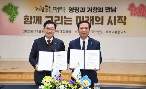 경남 거창군은 지난 8일 경기 양평군청에서 양평군과 미래 지향적인 협조체계 구축 및 공동 발전과 번영을 위한 우호교류 협약을 체결했다.