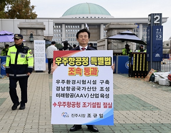 조규일 시장은 이날 '우주항공청 특별법 조속 통과, 우주환경시험시설 구축·경남항공국가산단 조성·미래항공(AAV) 산업 육성을 위해서는 우주항공청 조기설립 절실'이라는 문구가 적힌 피켓을 들고 1인 시위에 나섰다.
