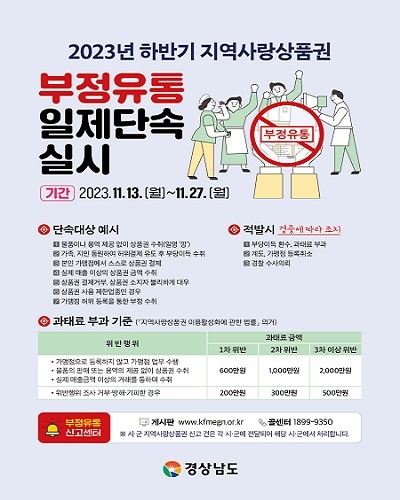 경남 김해시는 오는 13일부터 27일까지 김해사랑상품권 부정유통 일제단속을 실시한다고 10일 밝혔다.