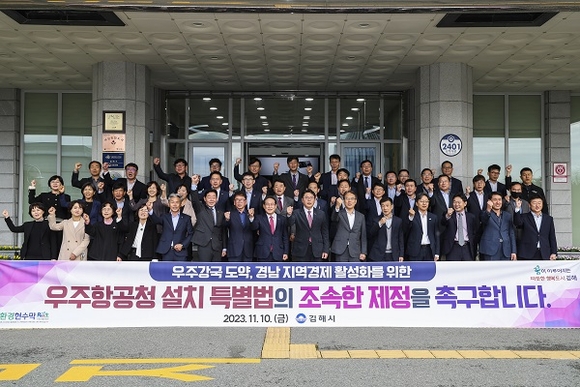 경남 김해시는 10일 시청 본관 앞에서 홍태용 시장과 간부공무원 50여명이 함께 '우주항공청의 설치 및 운영에 관한 특별법'의 제정을 촉구하는 캠페인을 벌였다.