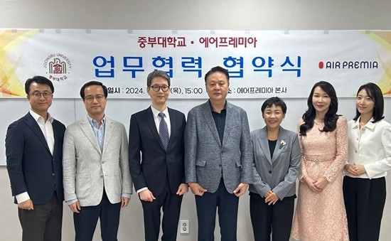 이날 협약식에는 중부대학교 이정열 총장, 전미옥 대외협력처장, 유정화 항공서비스학전공 학과장, 김미영 항공서비스학전공 교수, 에어프레미아 유명섭 대표, 박영철 경영지원실장, 진한수 객실본부장 등이 참석한 가운데 진행됐다.