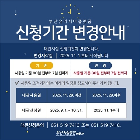 부산시설공단은 교육·세미나 전용 공간으로 주목받고 있는 부산유라시아플랫폼 대관신청 가능 기간을 오는 11월 1일부터 사용일 기준 ‘90일 전부터 7일 전까지’에서 ‘30일 전부터 7일 전까지’로 변경한다고 4일 밝혔다.