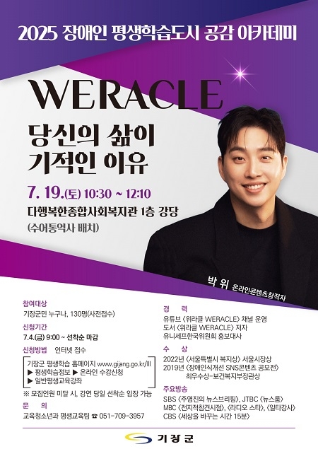 부산 기장군이 오는 19일 오전 다행복한종합사회복지관 1층 강당에서 ‘2025 장애인 평생학습도시 공감 아카데미’ 강연을 개최한다고 9일 밝혔다.