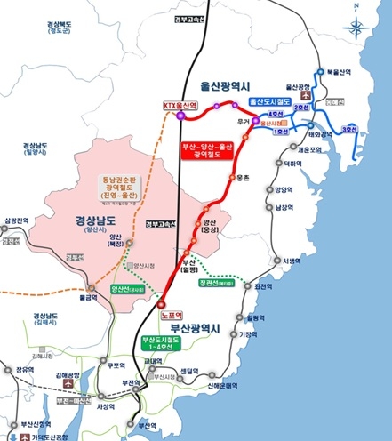 '부산~양산~울산 광역철도'는 총 연장 47.4km의, 부산(노포)에서 양산(웅상)을 거쳐 경부고속선 울산역(언양)까지 총 11개 정거장을 연결하는 철도 노선으로 2조 5475억 원이 투입될 예정이다.