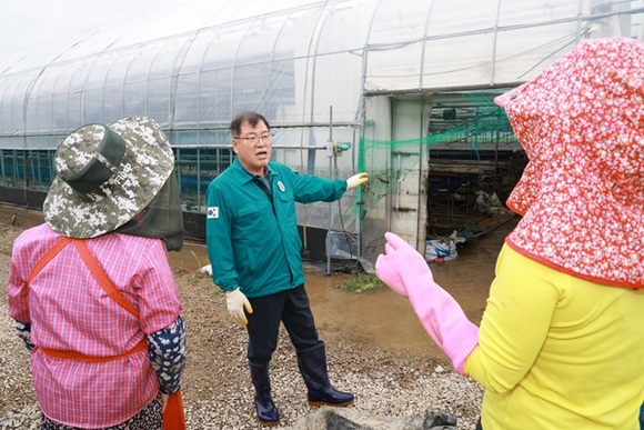 이승화 군수는 18일 딸기농가와 바나나농가 등을 찾아 피해 상황을 확인하고 신속한 복구에 온 힘을 다할 것을 주문했다.