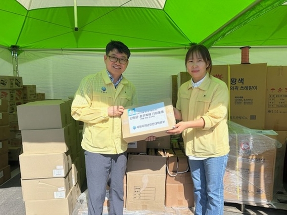 이날 김제홍 사천시 부시장과 직원 등은 폭염에 피해 복구를 위해 애쓰고 있는 봉사자들을 위해 선스틱 200개, 쿨토시 200개 등의 폭염 대응 물품을 지원했다.