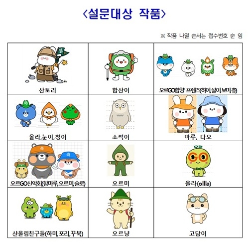 한편 이번 선호도 조사 결과는 최종 심사에 활용되며, 2차 심사를 통해 금상, 은상, 동상 등 수상작이 8월 말 발표될 예정이다. 선정된 캐릭터는 '오르GO 함양' 홍보물, 기념품 제작 등 다양한 분야에서 활용될 계획이다.