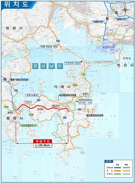 '거제~통영 고속도로'는 총연장 20.9km로, 통영 용남면(통영나들목)에서 거제 상문동(거제나들목)을 잇는 구간이다. 총사업비 1조 5천억 원이 투입되며, 나들목(IC) 3곳, 교량 16개소(4.5km), 터널 6개소(6.6km) 등이 포함된다.