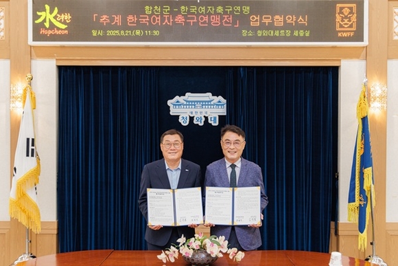 경남 합천군은 지난 21일 합천영상테마파크 청와대 세트장에서 2025~2028년 추계 한국여자축구연맹전 유치 협약식을 가졌다.