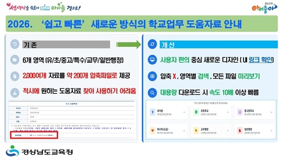 경남도교육청은 도내 유치원, 초중고, 특수학교 교직원의 업무 편의성을 높이기 위한 '새로운 학교업무 도움자료 시스템'을 전면 시행한다고 26일 밝혔다.