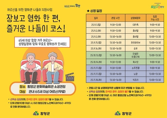 경남 함양군은 관내 65세 이상 어르신들의 문화생활을 지원하기 위해 오는 9월 1일부터 11월 18일까지 무료 영화 상영 서비스를 운영한다고 26일 밝혔다.