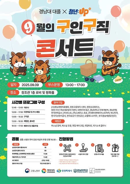 ‘구월 구인·구직 콘서트’라는 이름으로 치러지는 이번 잡 페스티벌은 대학생과 지역 청년들이 직접 참여해 진로를 탐색하고, 다양한 체험을 통해 실질적인 취업 정보를 얻을 수 있도록 기획됐다. 행사는 경남대 대학일자리플러스센터와 경남경영자총협회가 함께 마련했다.