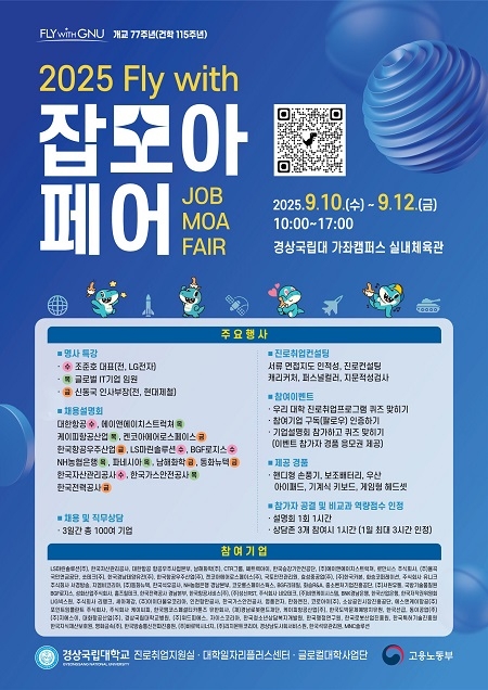 경상국립대학교는 대학 재학생과 졸업생, 나아가 지역 청년들의 취업을 지원하기 위해 오는 10일부터 12일까지 3일간 가좌캠퍼스 체육관에서 ‘2025학년도 Fly with 잡(Job) 모아 페어(Fair)’를 개최한다고 8일 밝혔다.