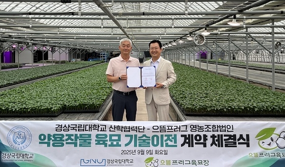 경상국립대학교 산학협력단은 9일 으뜸프러그 영농조합법인에 ‘참당귀와 지황 약용작물 육묘’ 관련 기술(연구책임자 황승재 농업생명과학대학 원예과학부 교수)을 이전하는 협약을 체결했다고 밝혔다.