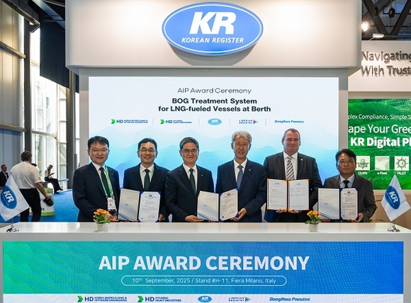 한국선급(KR)이 10일(현지시간) 이탈리아 밀라노에서 열리고 있는 ‘가스텍 2025(Gastech 2025)’에서 HD한국조선해양이 제안하고 HD현대중공업과 동화뉴텍이 공동 개발한 ‘LNG 증발가스(BOG, Boil-off-Gas) 처리설비’에 대해 라이베리아 기국과 함께 개념승인(AIP, Approval In Principle)을 수여했다.