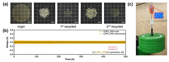 연구팀은 해당 고분자 전해질을 합성한 뒤 리튬금속 전지에 적용해 장시간 구동 안정성과 전극 계면 접착력을 확인했다. 또한 사용 후 소재를 용매 처리해 전해질 고분자와 리튬염을 분리할 수 있을 뿐 아니라, 분리 전 소재 자체를 전해질로 재사용하는 것도 가능함을 보여줌으로써 기존 전해질에서는 구현하기 어려웠던 완전 재활용 전지 시스템을 실증했다.