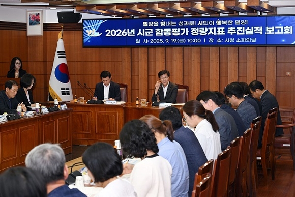 경남 밀양시는 19일 시청 소회의실에서 곽근석 부시장 주재로 정량 지표 담당 부서장 28명이 참석한 가운데 '2026년(2025년 실적) 시군 합동평가 정량 지표 추진 실적 보고회'를 가졌다.