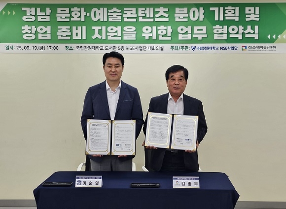 경남문화예술진흥원과 국립창원대학교 RISE사업단은 19일 창원대에서 도내 문화예술·콘텐츠 분야 기획 및 창업 생태계 활성화를 위한 업무협약을 체결했다.