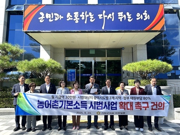 거창군의회가 23일 정부가 추진하고 있는 '농어촌기본소득 시범사업'과 관련해 시범 대상 확대와 재원 구조 개선, 지급액 상향 조정 등을 강력히 촉구하는 건의문을 발표했다.