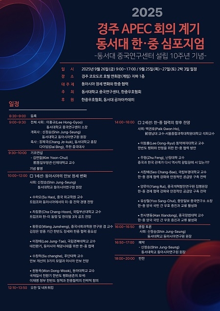 이번 2025년 경주 APEC 계기 동서대 한·중 심포지엄은 한·중 양국의 전략적 소통과 협력 가능성을 모색할 수 있는 의미있는 자리가 될 것이다. 아울러 이번 2025년 경주 APEC 계기 동서대 한·중 심포지엄을 통해 양국의 관계가 진정한 해빙 모드로 전환돼 새로운 국면을 맞이하길 희망해본다.