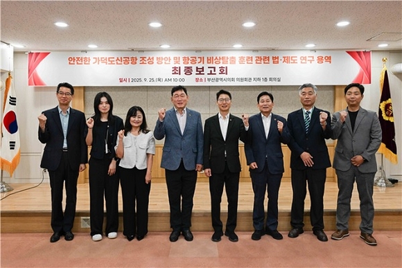 부산시의회 의원연구단체 ‘가덕도신공항 추진 연구모임’이 지난 25일 시의회에서 '안전한 가덕도신공항 조성 방안 및 항공기 비상탈출 훈련 관련 법·제도 연구' 용역 최종보고회 및 간담회를 열었다.
