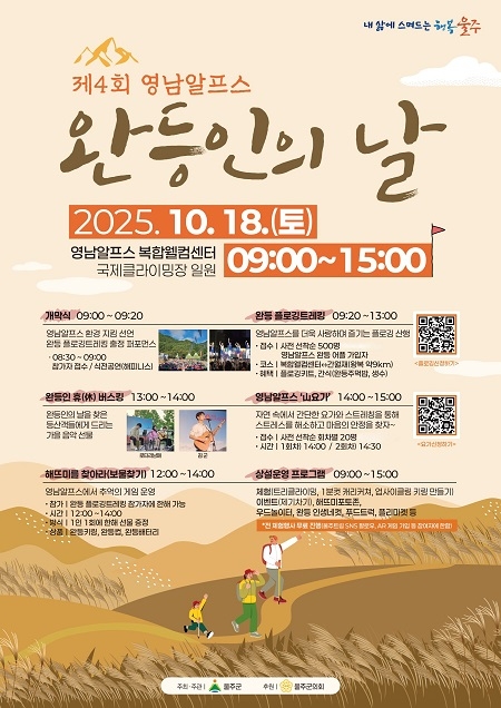 울산 울주군이 10월 18일 영남알프스 복합웰컴센터에서 ‘제4회 영남알프스 완등인의 날’ 행사를 개최한다고 30일 밝혔다.
