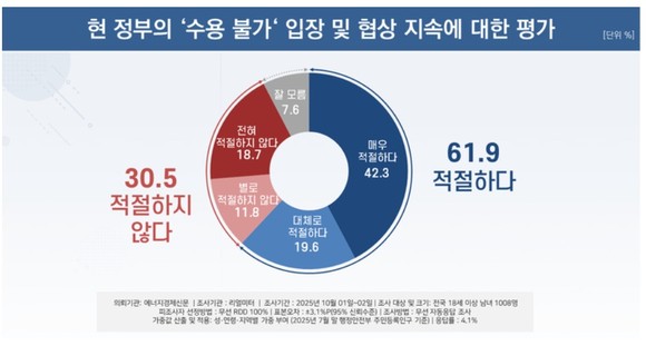 아울러 같은 조사에서 ‘수용 불가’ 입장을 내세우며 미국과 협상을 계속하고 있는 현 정부의 대응에 대해 ‘적절하다’는 긍정적인 답변이 61.9%(‘매우 적절하다’ 42.3%, ‘대체로 적절하다’ 19.6%)였던 반면, ‘적절하지 않다’는 부정적인 답변은 30.5%(‘전혀 적절치 않다’ 18.7%, ‘별로 적절치 않다’ 11.8%)로 ‘적절하다’는 답변이 31.4%p 우세했다.