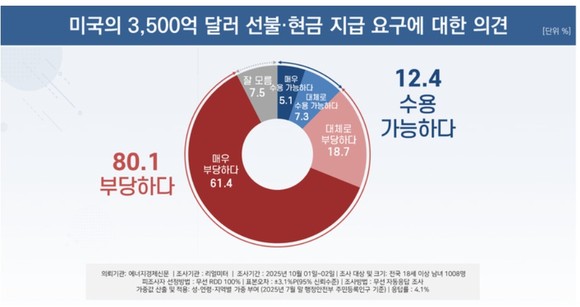 여론조사 전문기관 <리얼미터>가 에너지경제신문 의뢰로 지난 1∼2일 전국 만18세 이상 유권자 1008명을 대상으로 실시한 조사에서 ‘미국의 3500만 불 대미 투자 선불 지급 요구에 대해 어떻게 생각하는가?’라는 질문에 ‘부당하다’는 부정적인 답변은 80.1%(‘매우 부당하다’ 61.4%, ‘대체로 부당하다’ 18.7%)인 반면, ‘수용 가능하다’는 긍정적인 답변은 12.4%(‘매우 가능하다’ 5.1%·‘대체로 가능하다’ 7.3%)에 불과했다.