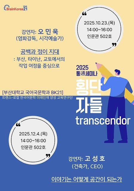 부산대학교 국어국문학과 BK21 트랜스-로컬 한국어문학 미래인재 양성 교육연구단은 오는 23일과 12월 4일 두 차례에 걸쳐 오민욱 영화감독과 고성호 건축가를 초대해 경계를 허물고 통합적 시각을 기르기 위한 '통(通)세미나: 횡단자들' 행사를 개최한다고 16일 밝혔다.