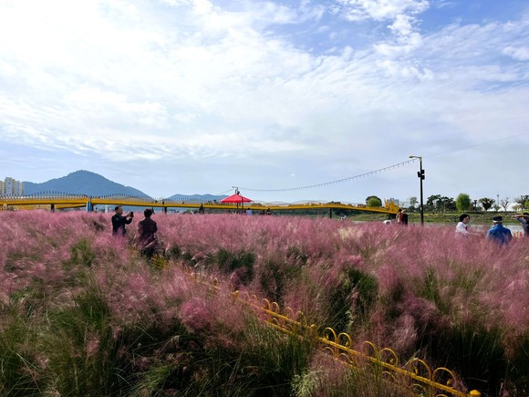 장성군 황룡강 가을꽃축제 이튿날인 19일, 강변 곳곳마다 활짝 핀 가을꽃들이 방문객을 반기고 있다. 특히 용작교, 황룡정원 방면 백일홍과 연꽃정원 코스모스, 문화대교 인근 핑크뮬리가 아름답다.