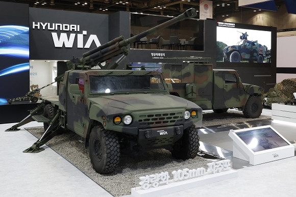 이번 전시에서 현대위아는 ‘경량화 105㎜ 자주포’를 실물로 공개했다. 기존 105㎜ 자주포의 무게를 절반 이상으로 경량화해 소형전술차량에 탑재한 제품이다. 국방신속획득기술연구원의 신속연구개발사업을 통해 개발한 자주포로 18㎞의 최대 사거리를 보유하고 있다. 전시 상황에서는 빠르게 사격 지휘와 탄약 운반을 할 수 있도록 사격지휘차량, 탄약운반차량과 함께 운용하도록 구성했다. 경량화를 통해 헬기를 통한 공중 수송도 가능하다.