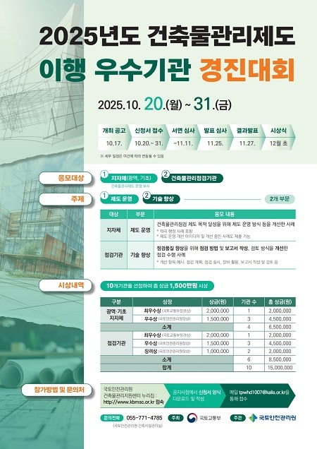 지자체 부서와 건축물관리점검기관을 대상으로 하는 이번 경진대회는 제도 운영과 기술 향상 부문으로 나누어 진행되며, 접수는 20일부터 31일까지로 계획돼 있다.