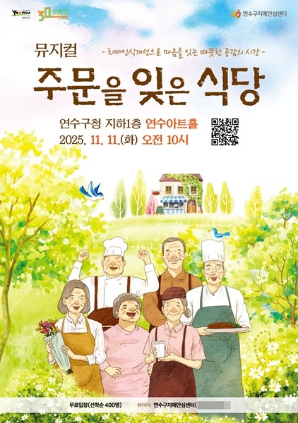 인천시 연수구는 오는 11월 11일 오전 10시, 연수아트홀에서 지역 주민의 치매에 관한 올바른 이해와 인식 개선을 위한 뮤지컬 ‘주문을 잊은 식당’을 공연한다.