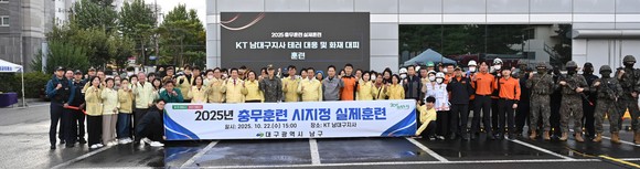 (CNB뉴스=신규성 기자) 대구 남구는 지난 22일 KT 남대구지사 주차장에서 테러범 인질극 상황을 가정한 인질 구출·테러범 제압 훈련과 드론 테러로 인한 화재 발생에 대비한 대피·진화 훈련 등을 포함한 ‘2025 충무훈련 실제훈련’을 실시했다.