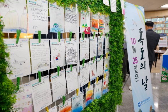 또 22~24일에는 본청 1층에 촛대바위, 일몰 등 독도 주변과 울릉도에서 바라본 독도, 독도 법령, 독도 연표 등이 전시된 사진과 초등학교 학생들이 독도를 사랑하는 마음을 담아 작성한 손글씨 엽서 등을 전시했다.