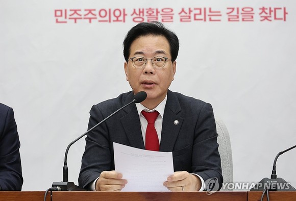 국민의힘 송언석 원내대표는 28일 국회에서 열린 국정감사 대책 회의에서 “민주당 정청래 대표의 ‘APEC 기간 무정쟁 주간’ 제안은 경제 참사·부동산 참사를 덮기 위한 침묵 강요이자 정치적 물타기”라고 비판했다. (사진=연합뉴스)