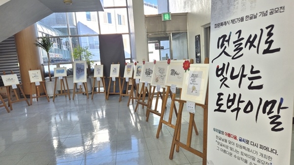 경남 창원시가 제579돌 한글날(10월 9일)을 기념해 연 '멋글씨로 빛나는 토박이말 공모전'의 수상작 전시회를 연다. 전시는 28일부터 11월 6일까지 창원시청 본관 1층 로비에서 열린다.