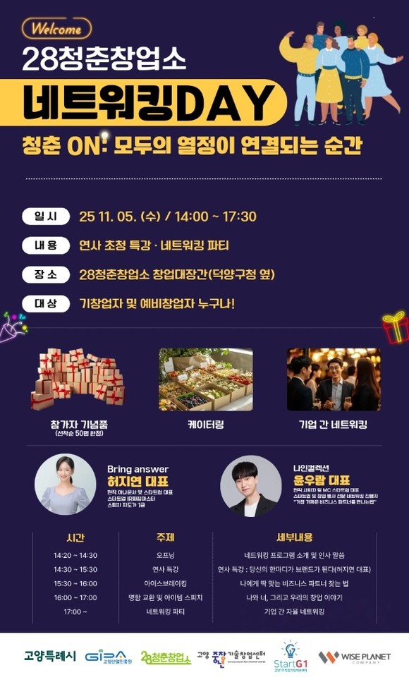 고양산업진흥원 28청춘창업소가 11월 5일 덕양구 28청춘창업소에서 하반기 네트워킹 데이를 열고 팀빌딩·네트워킹 프로그램을 통해 청년 창업가 간 협업 기회를 모색한다. 현직 아나운서 겸 스타트업 대표 허지연이 말하기·IR 피칭 특강을 진행한다.