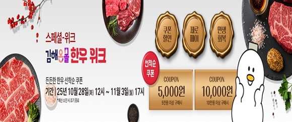 이번 '김해온몰 한우WEEK' 기획전은 김해축협 및 관내 축산 업체가 참여하며 5만 원 이상 구매 시 5천 원, 10만 원 이상 구매 시 1만 원 할인 쿠폰을 제공한다. 또한 민생회복 소비쿠폰을 김해사랑상품권으로 발행할 경우 제로페이 결제로 사용 가능하며, 김해사랑·김해온몰 상품권 사용시 더욱 할인된 가격으로 구매 가능하다.