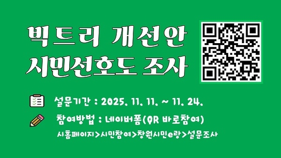설문 참여는 창원시청 누리집 및 네이버폼을 통해 가능하며, 임시개방 중인 빅트리 현장에서도 참여할 수 있다.