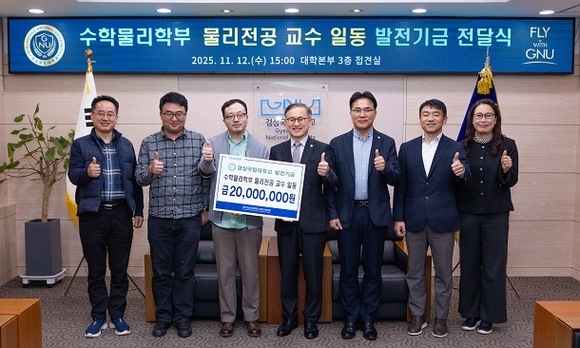 경상국립대학교는 자연과학대학 수학물리학부 물리전공 교수 10명이 대학 발전기금 2000만 원을 기부했다고 12일 밝혔다.