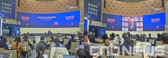 한국거래소 정은보 이사장(왼쪽)이 개회사를 하고 있고, 더불어민주당 코스피 5000 특별위원회 위원장인 오기형 의원이 영상 축사를 전하고 있다. (사진=손정호 기자)