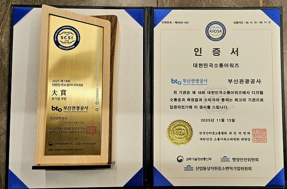 부산관광공사가 지난 13일, 국내 최대 규모와 권위의 디지털 소통 시상식 ‘제18회 대한민국소통어워즈’에서 부산관광 유튜브 채널 ‘비짓부산(VISIT BUSAN)’으로 공기업 부문 ‘소셜미디어대상’을 2년 연속 수상했다고 밝혔다.