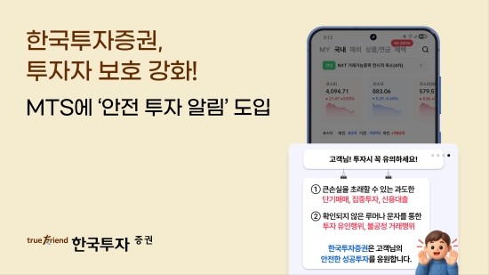 한국투자증권은 최근 금융당국의 방침에 따라 고령 투자자 보호 및 투자자 경각심 제고를 위한 ‘안전 투자 알림’ 기능을 MTS에 적용했다. 이 기능은 단기 매매, 집중 투자, 신용 거래 등 위험도가 높은 투자 패턴이 나타날 경우 일 1~2회 경고 문구를 제공해 투자자가 스스로 위험을 인지할 수 있도록 돕는다.